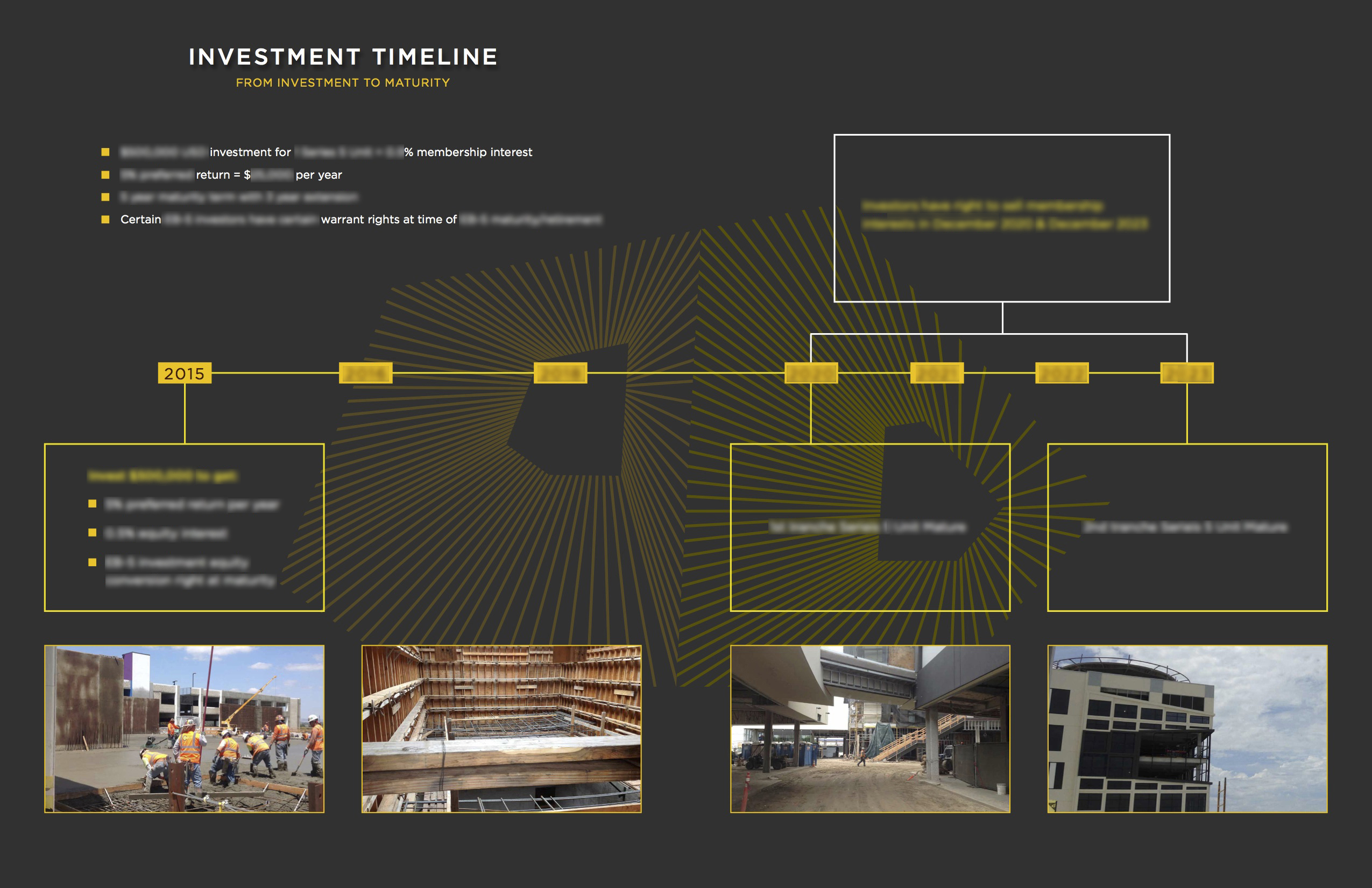 Letter portrait format equity brochure for investors. I expanded on the art direction and flipped the color and mood to a more darker page and graphics look. Retaining a sense of visual upscale with combining dramatic layouts of site project renderings made this a fun and fairly quick project to produce!