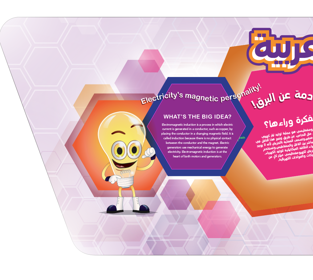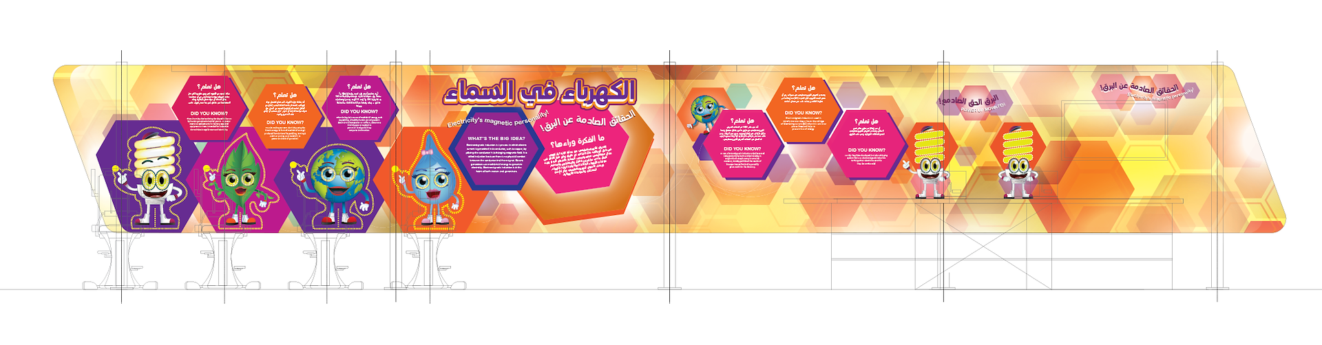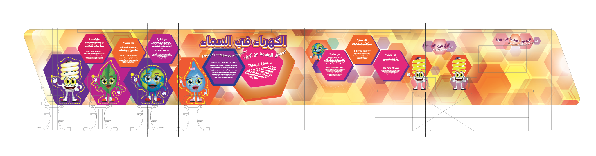 I designed large scale environmental and signage graphics for a major museum project in Dohar, Qatar, Saudi Arabia. The museum is focused on energy conservation and education for K-12 audience. My role was to take existing visual assets and create new and exciting graphic design work for various science based exhibits.