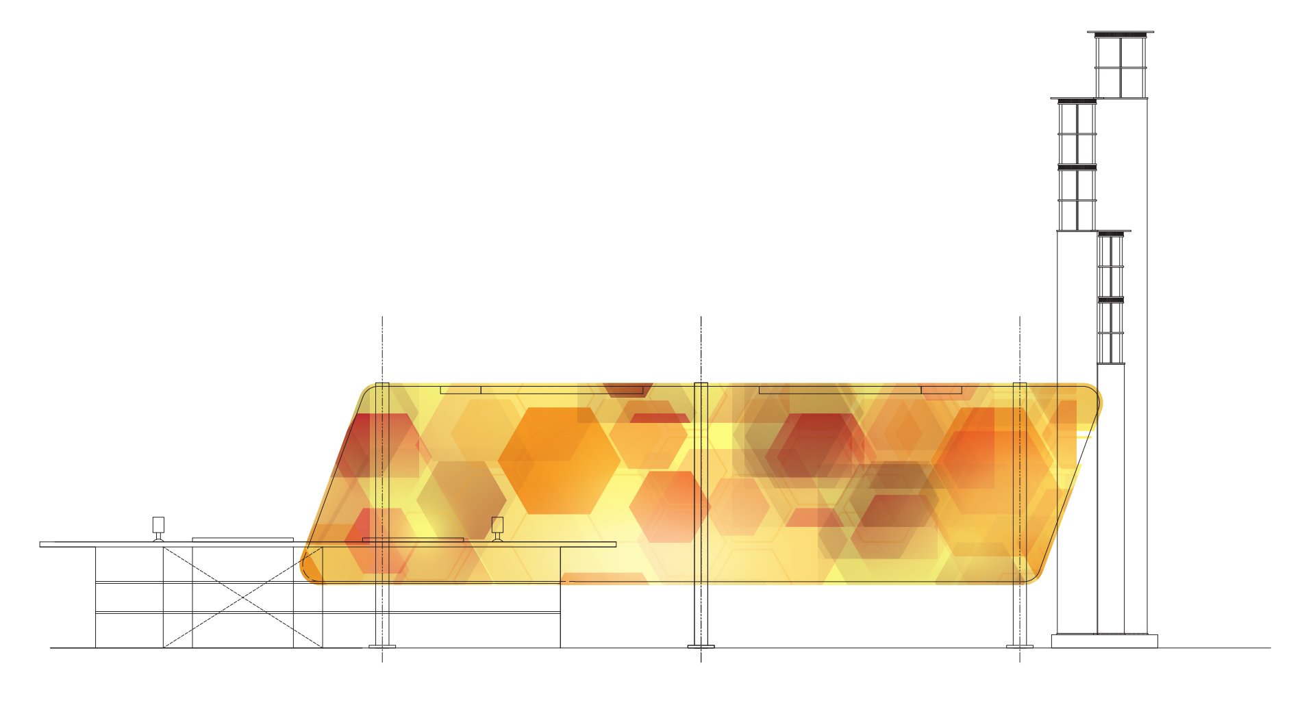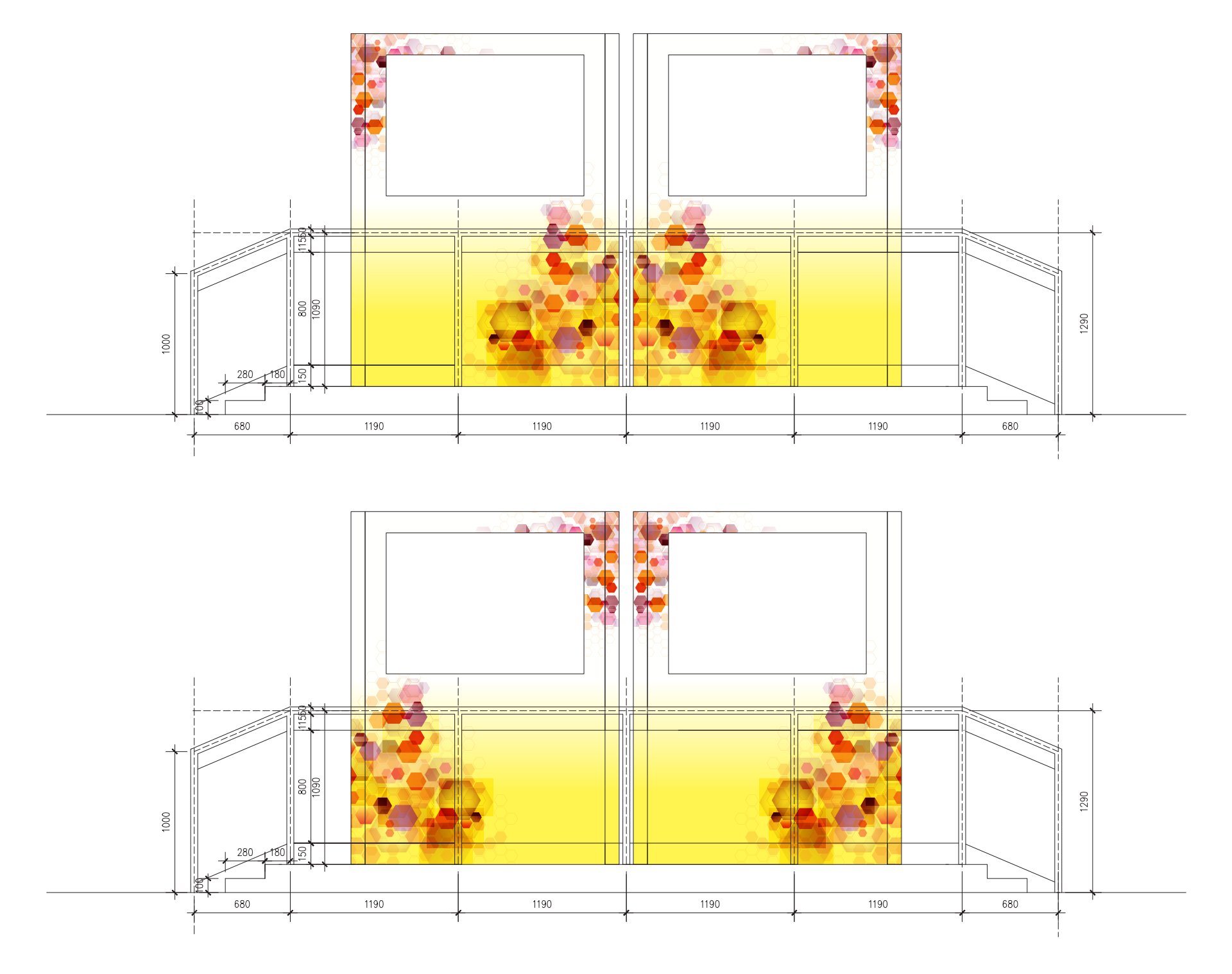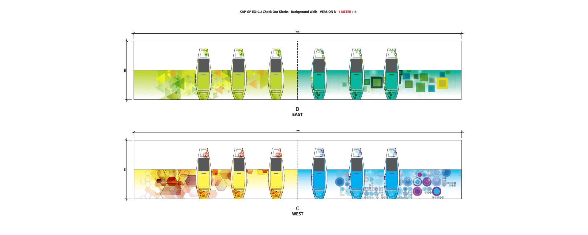 As you can see the graphics wrap around the four sided tower. I created this effect to give the area this will be placed in an energetic, vibrant mood and make the viewer walk around the tower.