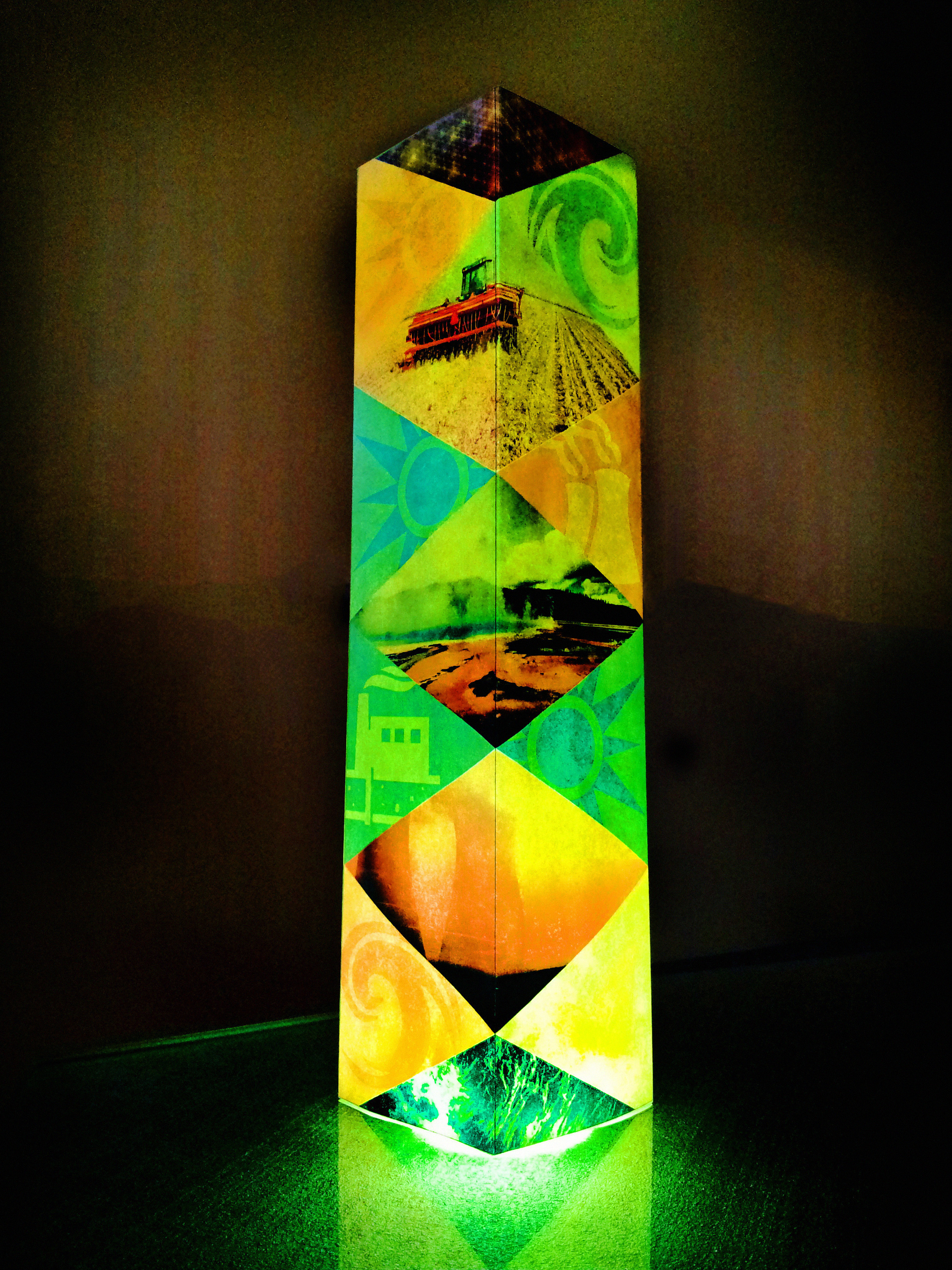 The exhibit area has a theme of alternative energy technology geared towards children. I chose to make this an art-piece in that I wanted the tower to captivate and visually show the natural elements used in alternative energy and mix them with the exhibit-thematic colors, triangular shapes and iconography.