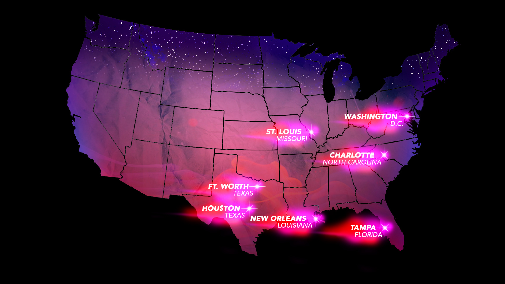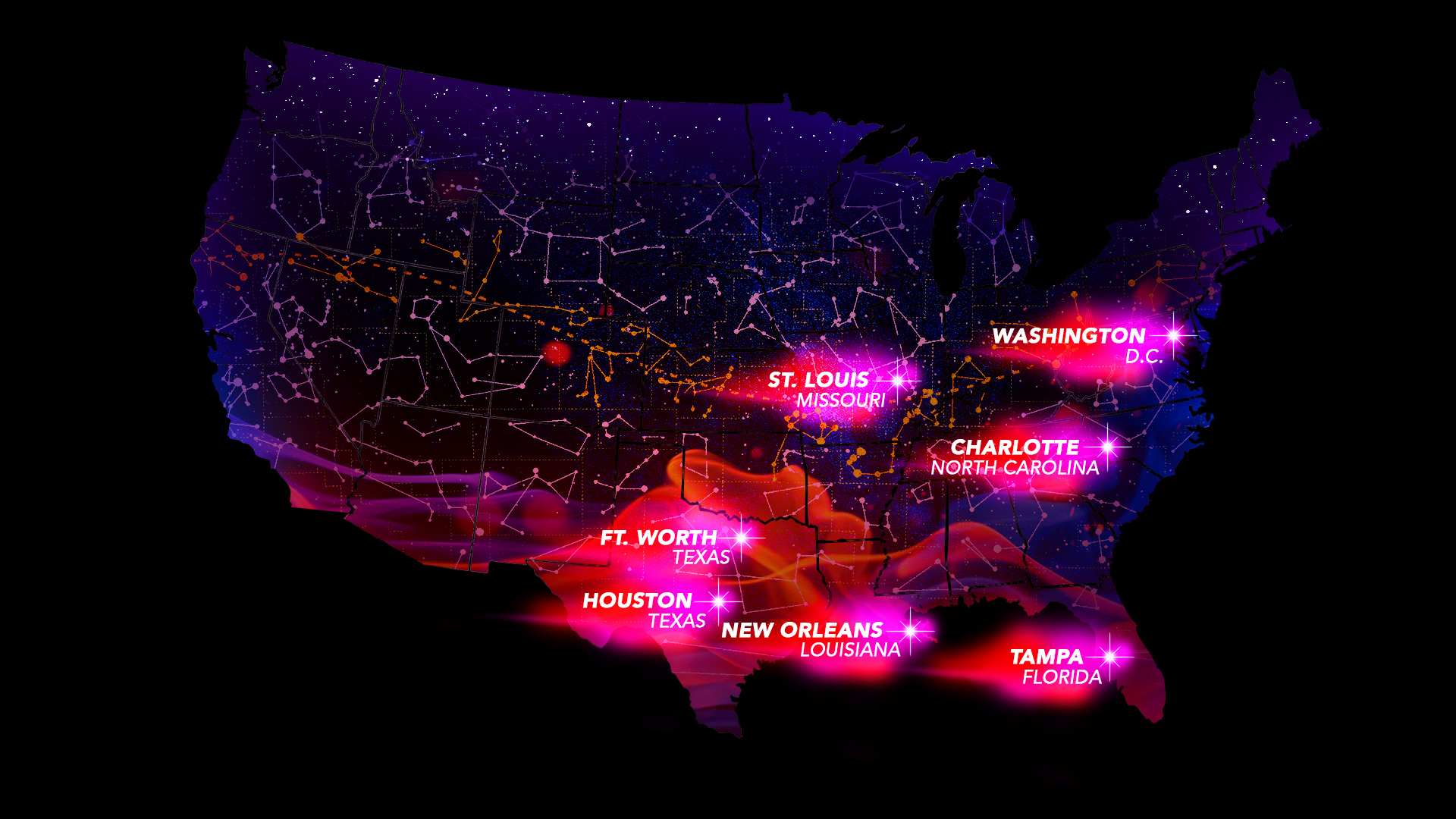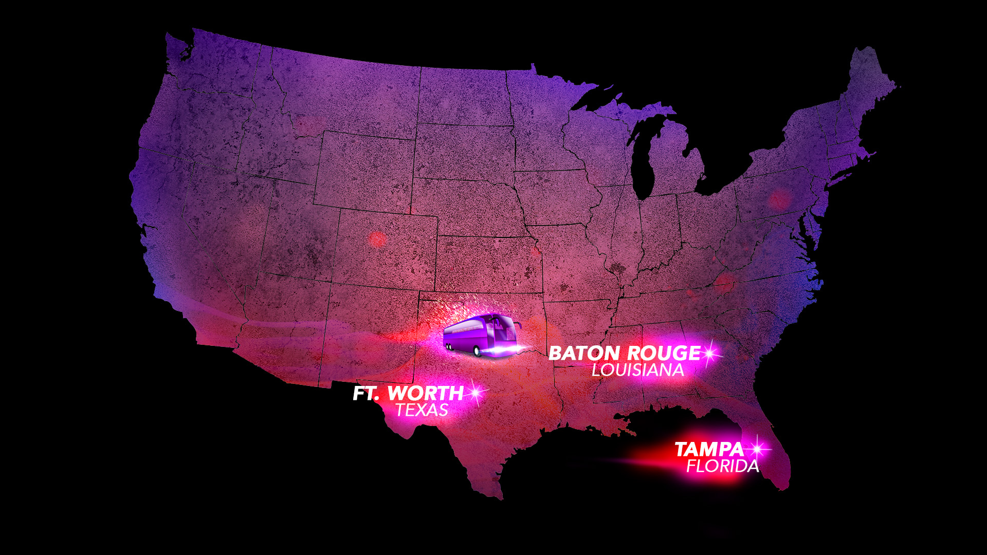 The first set of colorful graphics were for the TV show ‘Bring It!’. The map was a guide map of where the performers were heading to next in a competition tour. My creative vision was to create magical visuals to match the outfits of the performers, as if to spread stardust across the USA.