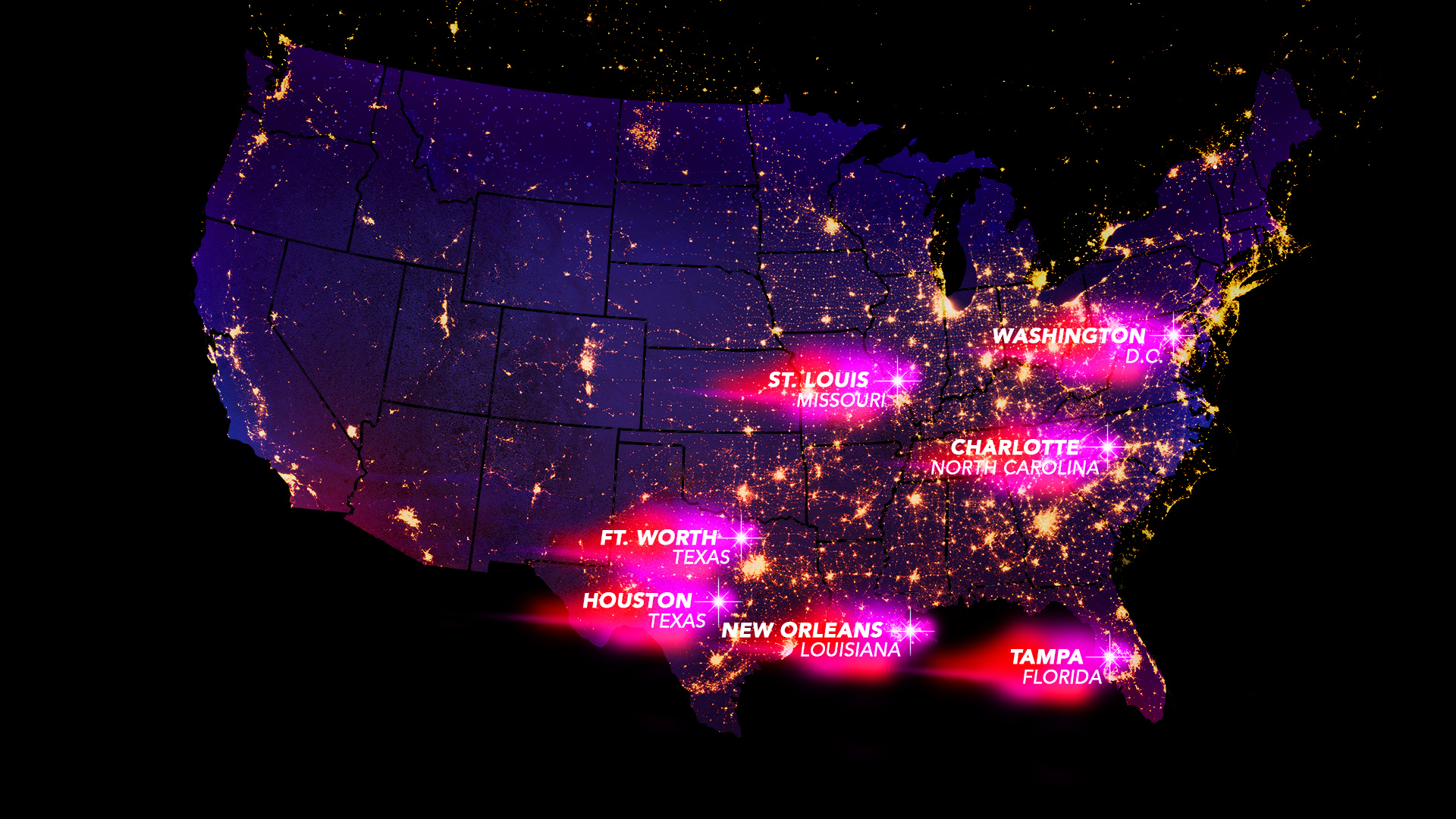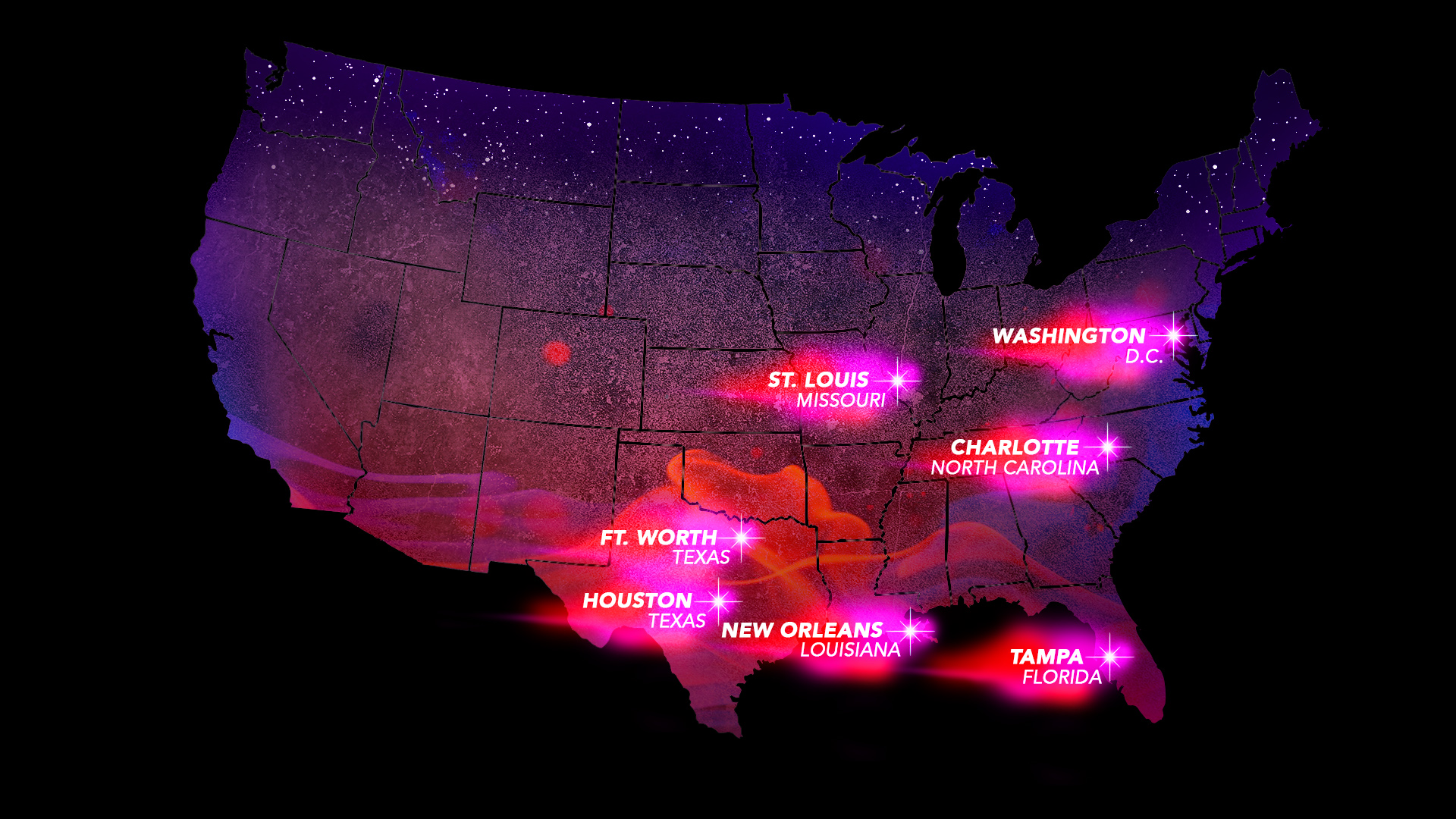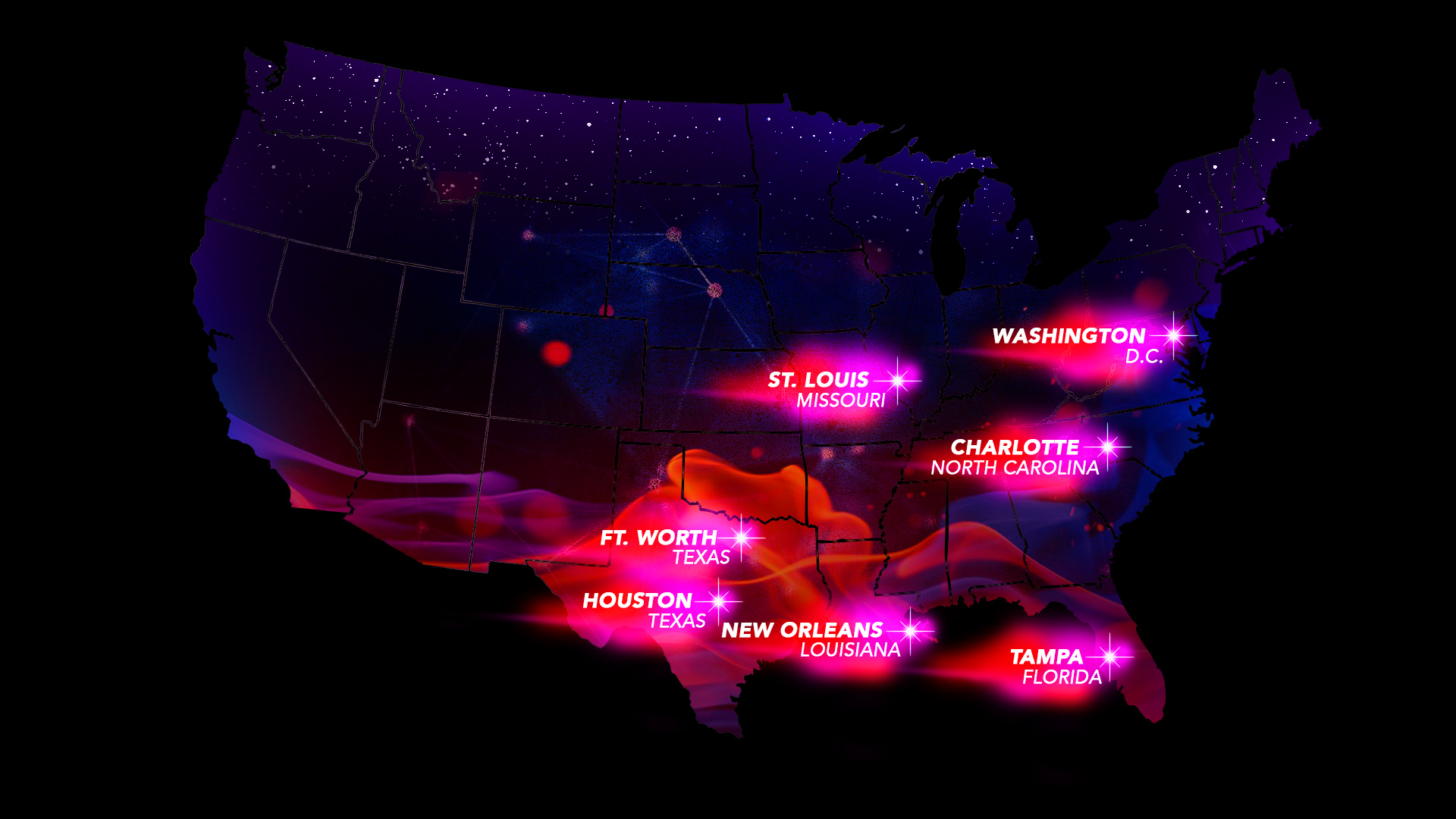 The first set of colorful graphics were for the TV show ‘Bring It!’. The map was a guide map of where the performers were heading to next in a competition tour. My creative vision was to create magical visuals to match the outfits of the performers, as if to spread stardust across the USA.
